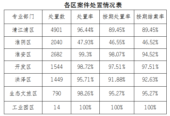 案件应处置数前三名分别是清江浦区5082件、淮阴区4256件、淮安区2701件,结案率分别为96.40%、47.91%、95.34%,按期处置率分别为89.45%、46.55%、98.07%,按期结案率分别为89.45%、46.52%、94.52%。本月除淮阴区外,其余各区三项运行指标均达到国家住建部标准要求。