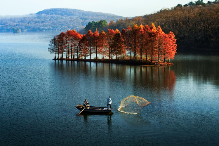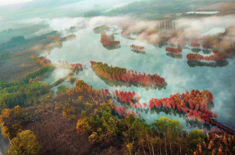 初冬时节,盱眙天泉湖旅游度假区层林尽染,万只鸟儿从北方飞回,吸引众多观鸟摄影爱好者、游客前来观赏。