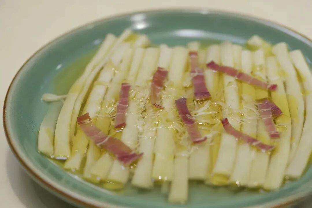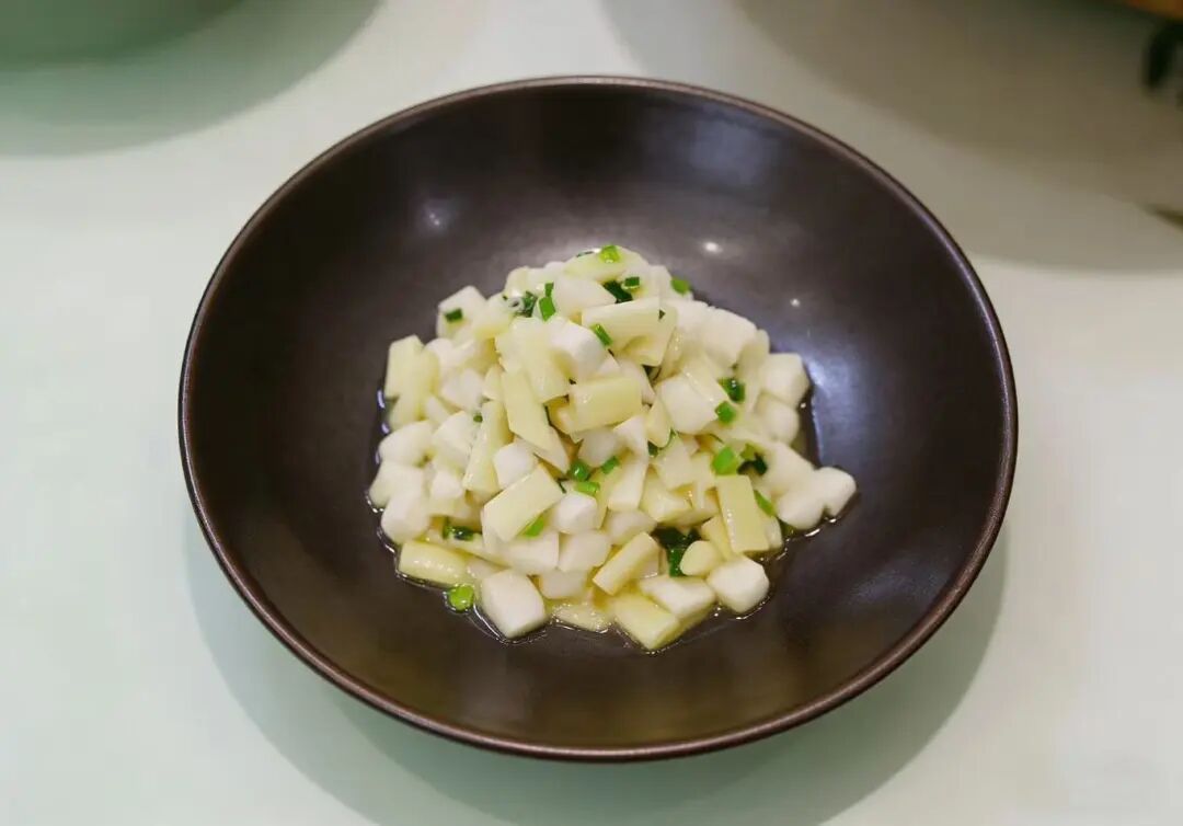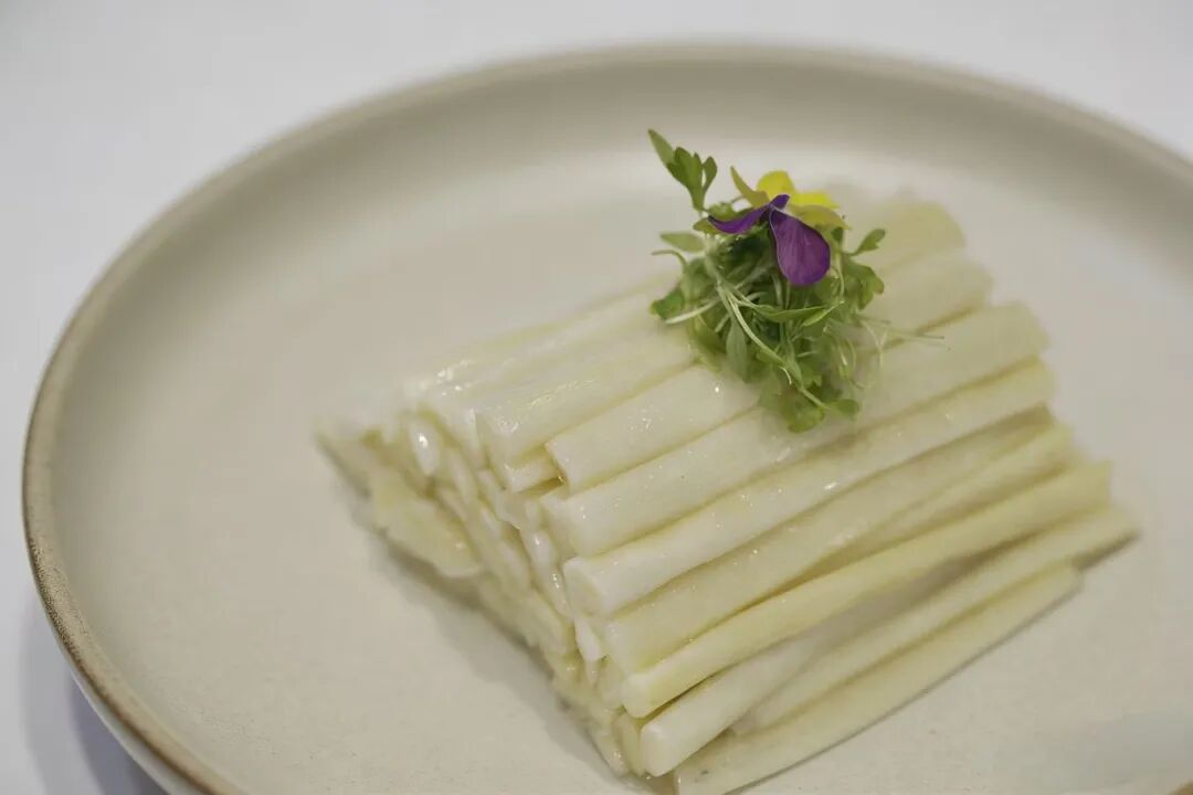 这道菜追求的是蒲菜的本味。蒲菜简单焯熟,码齐装盘,随后淋上一勺精心调制的调味汁。酸甜的汁水,恰到好处地包裹住蒲菜,既提味,又不掩其清甜本真之味。