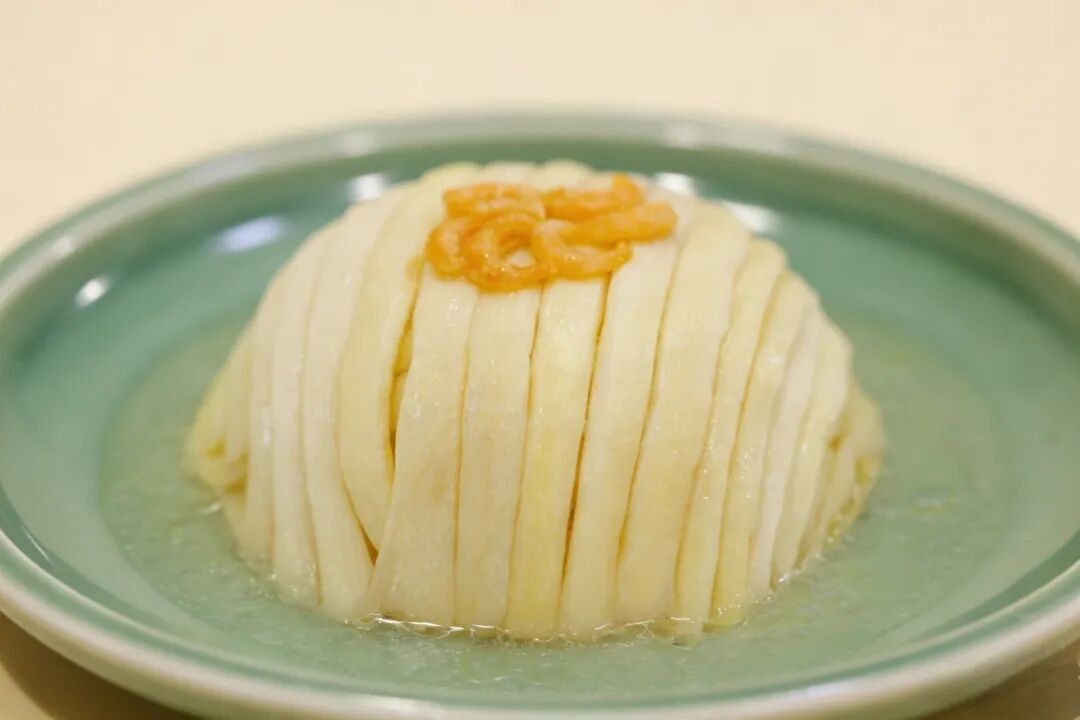作为淮扬菜中的经典,也是上榜“百县千味”的地标美食,它选用的是当季的嫩蒲菜,与金钩虾米和鸡汤一起烹制。开洋的咸鲜与汤汁的醇厚,尽数被蒲菜吸收。菜品色泽淡雅,蒲菜鲜美入味,回味悠长。