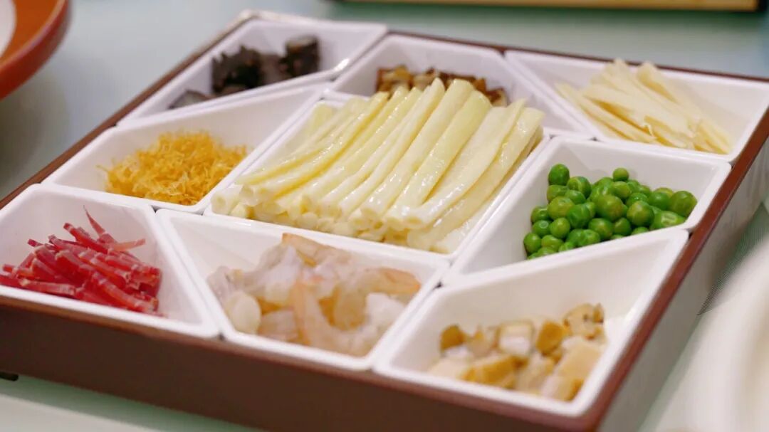 淮扬菜善于融合各地烹饪精华并创新为己所用。“生焗”是一种不加水、仅靠食材自身水分和砂锅高温将食物焗熟的技法。将虾仁、香菇、青豆、干贝、火腿等八种食材,与蒲菜一同倒入砂锅,淋入秘制酱料,大火焗透。开盖的瞬间,香气夺人,蒲菜脆嫩依旧,八种食材的鲜香尽数渗入其中,锅气十足,满口留香。