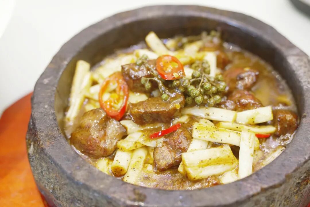 蒲菜与牛肉的组合,早在两千年前便已有记载,西汉枚乘在《七发》中写道“犓牛之腴,菜以笋蒲”。这道菜将牛上脑与蒲菜一同烹制,加入黑椒汁,最后再加青花椒丰富滋味。既是传承,亦是创新。