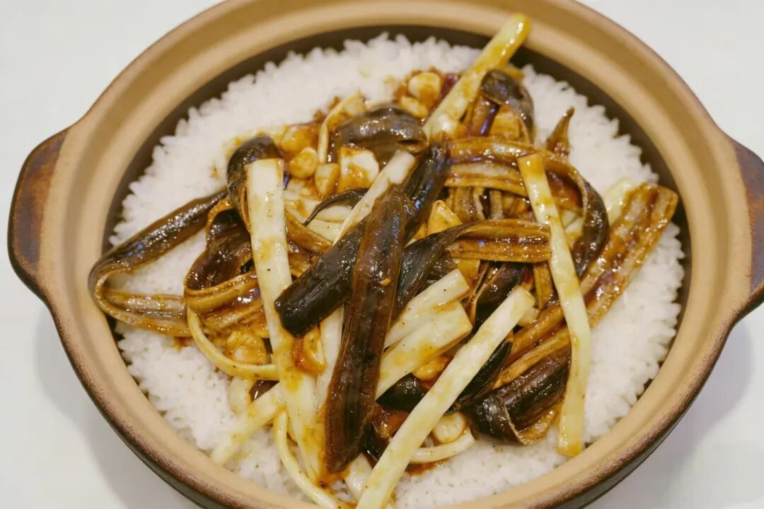 软兜+蒲菜,淮扬菜一次妙趣横生的创新。它将淮安两大瑰宝巧妙融合,并以“捞饭”的形式呈现,既在情理之中,又出乎意料之外。软兜与蒲菜一同烹制成浓郁浇头,趁热浇在晶莹的米饭上。拌匀后,既有鳝鱼的弹滑,又有蒲菜的清口,酱汁包裹着米粒,层次丰富,酣畅淋漓。