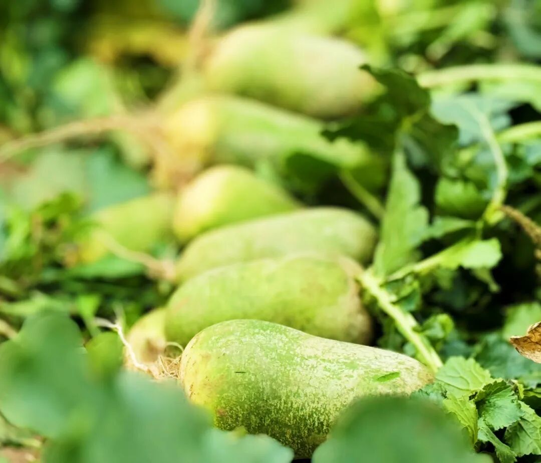 淮阴区流传着一句话:“淮阴人真奇怪,萝卜当作水果卖。”能有这份待遇的,唯有果林村的紫芽青萝卜。它大半截身子探出泥土,通体裹着翠玉般的绿衣,只在尾部留一抹雪白,头顶的嫩芽透着别致的紫色,“紫芽青”的名号便由此而来。轻轻掰开,清脆的声响伴着清甜的汁水,咬上一口,脆生生、甜津津,没有普通萝卜的辛辣味,满口都是清爽的果香。