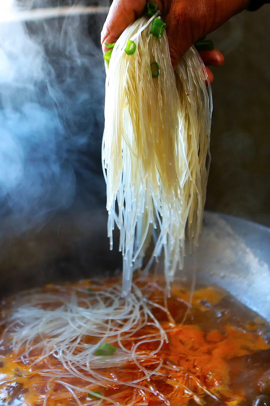 “可以下粉丝了!” 冯家祥抓起一把粉丝,“唰”地投入锅中,粉丝遇热迅速舒展,在汤里翻滚。“煮一分钟就行。”他用锅铲轻轻搅拌,吸饱了浓稠汤汁的粉丝,变得油亮诱人。装盘时,撒上一把葱花,热气腾腾中,牛肉的醇香扑面而来,夹起一根粉丝入口,爽滑弹牙,香气在齿间迸发。