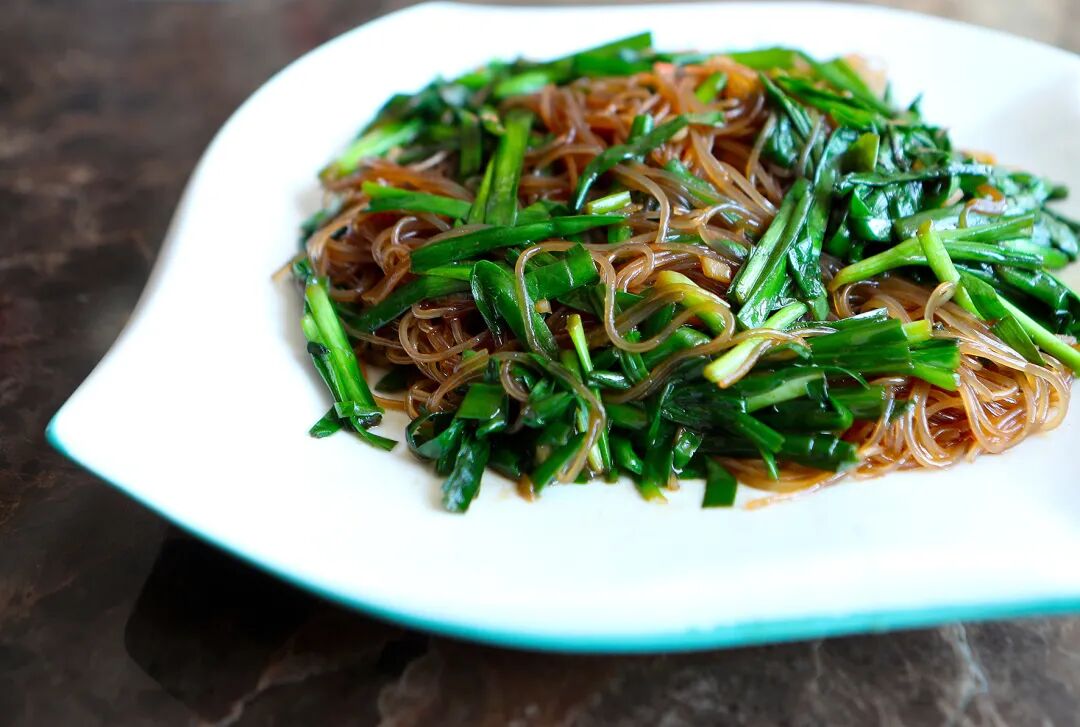 随后,冯家祥转身炒起韭菜粉丝。韭菜入锅“噼啪”作响,断生后盛出;泡好的粉丝下锅,用筷子快速拨散,避免粘连,酱油、盐、白糖调味,翻炒均匀。起锅时,粉丝裹着翠绿的韭菜,鲜香扑鼻。“有了这道菜,米饭都能多吃两碗!” 冯家祥笑着说。